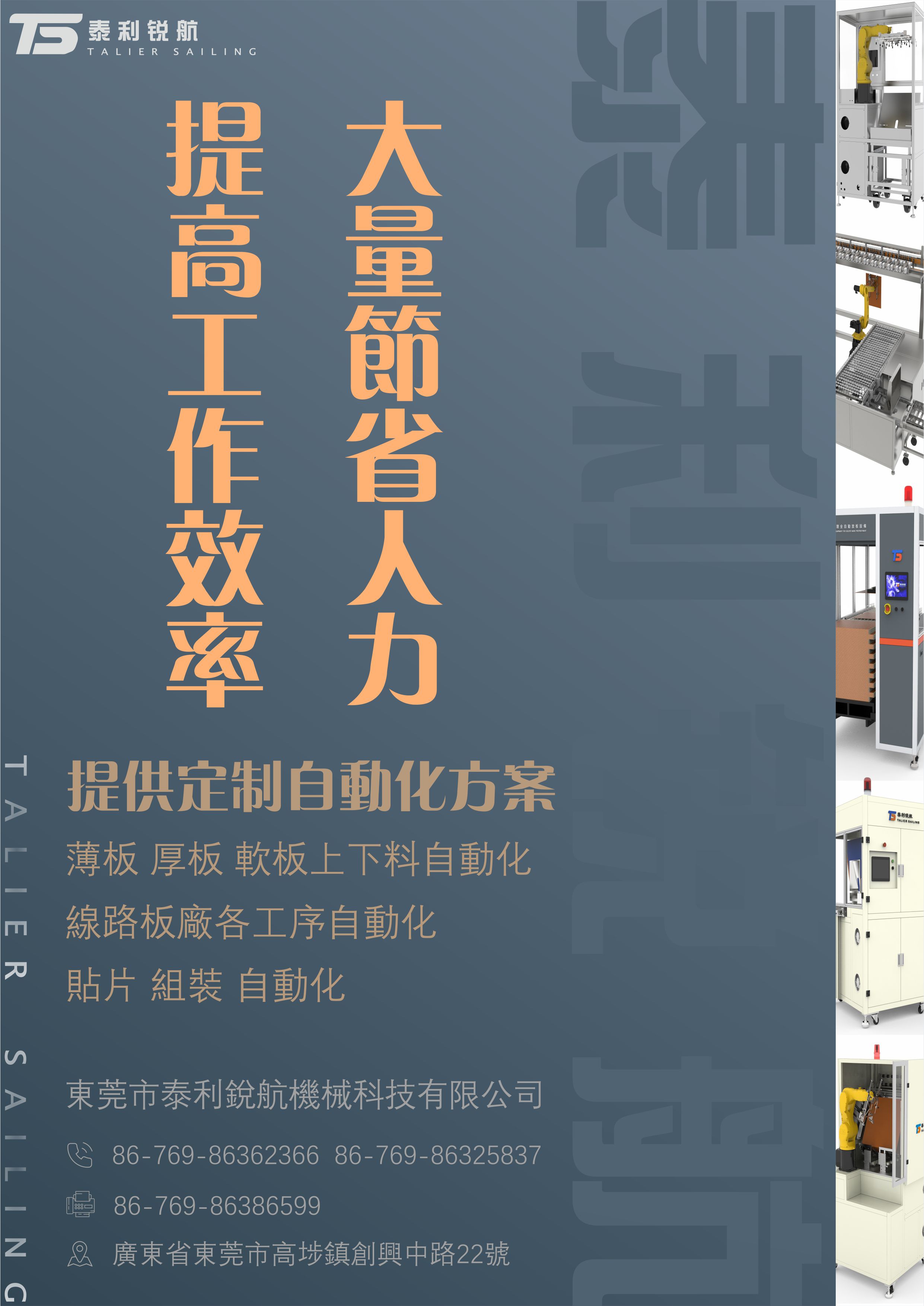 泰利锐航机械科技有限公司系列设备在自动化机械行业取得长远的发展,成绩斐然,发展稳健。为各大线路板厂提供定制各工序自动化方案。